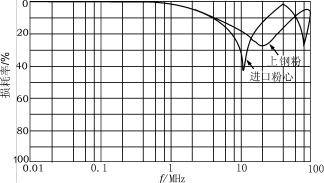 但是值得商榷的是,可選擇作為濾波器的差模電感的磁粉心不僅僅是μe=75鐵粉心一種,圖5是鐵粉心系列μe=75,μe=55,μe=35磁導(dǎo)率隨頻率變化的曲線,可見它們磁導(dǎo)率隨頻率上升而下降的趨勢不同。圖6是MICROMETARS公司-8(μe=35)和上海鋼研精密合金器材研究所SF-33(μe=37.5)鐵粉心材料的插入損耗曲線,可見吸收峰出現(xiàn)在不同的頻率范圍內(nèi),因此除了考慮電感量大小,磁飽和問題,價格等因素外,還應(yīng)該考慮抑制噪聲的頻率范圍,來選擇不同型號的鐵粉心。