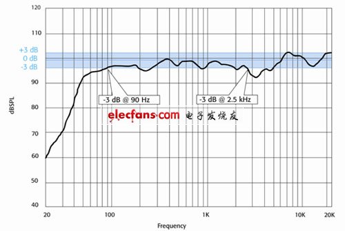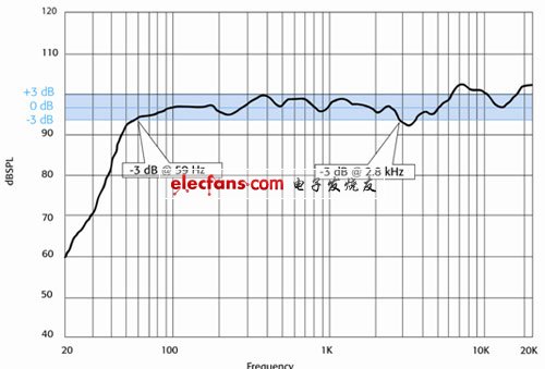 如果說+/-3dB所表示的是平坦特性,而不是頻率響應(yīng)范圍,那么這個(gè)參數(shù)對(duì)頻率特性而言還有什么意義?回答這個(gè)問題前我們可以看一下制造商在典型揚(yáng)聲器說明書上所標(biāo)注的“+/-3dB頻響。”