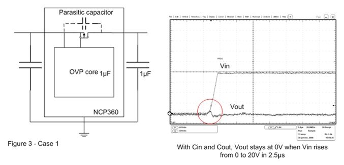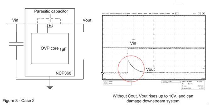 在圖3的案例2中,輸出電容已被移除。這樣,當(dāng)OVP器件輸入端出現(xiàn)快速輸入瞬態(tài)現(xiàn)象時,旁路元件將保持開路。這時可以在輸出端觀察到過 沖,這個過沖可能會損壞連接至OVP輸出端的電子元器件。為了解決這個問題,必須在輸出引腳上連接一個輸出電容,并盡量靠近OVP器件擺放。