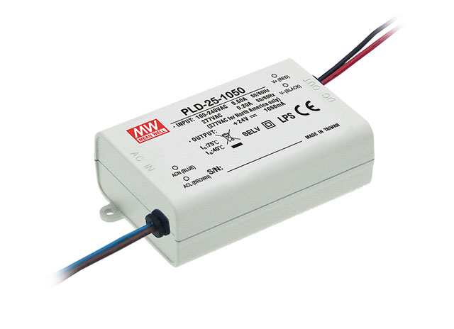 明緯繼完成了LPHC/LPLC-18(18W)、LPC-20(20W)、LPC-35(35W)、LPC-60(60W)等恒流式無PFC系列機(jī)種后,新推出了一款25W交流/直流具功率因子矯正(PFC)功能之塑料機(jī)殼型恒流式LED電源供應(yīng)器~PLD-25系列,以滿足需求低瓦數(shù)具PFC功能之室內(nèi)LED照明/裝飾光源相關(guān)應(yīng)用。PLD-25可接受90~295VAC交流輸入,除了可使用于一般115VAC或230VAC市電地區(qū),亦適用于北美地區(qū)277VAC之電力系統(tǒng)。