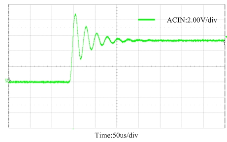 而在適配器熱插拔時(shí),也會(huì)出現(xiàn)瞬態(tài)的過(guò)壓電壓,由于適配器連接線的寄生電感效應(yīng),熱插拔時(shí)會(huì)產(chǎn)生瞬態(tài)的輸出振蕩波形,經(jīng)過(guò)一段時(shí)間的衰減后會(huì)穩(wěn)定在DC值。圖2為5.5V適配器熱插拔時(shí)的瞬態(tài)波形,通常適配器熱插拔時(shí)產(chǎn)生的瞬態(tài)過(guò)壓峰值電壓是其DC值的兩倍左右。