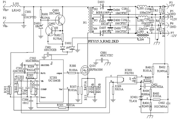 電源工作原理為:電路采用單端正激變換電路,當(dāng)變換器接通電源時(shí),輸入直流電壓經(jīng)由電阻、12V穩(wěn)壓管D601和三極管Q601、Q602組成的電路穩(wěn)壓降壓后, 啟動(dòng)UC3843進(jìn)入正常工作,偏置繞組L204的供電電路開始工作,輸出經(jīng)A4和C601整流及濾波后輸出12V電壓,高于自供電電壓,使二極管A4反偏,啟動(dòng)電路停止工作。變換器進(jìn)入正常工作后,電源依據(jù)PWM脈寬調(diào)制方式工作,次級(jí)繞組的輸出經(jīng)過二極管整流以及電容器和電感器組成的LC型濾波器濾波后,產(chǎn)生所需的各路輸出直流電壓。+5V的輸出電壓由電阻器R402和R406分壓后,與可編程穩(wěn)壓源TL431(U3)中的2.5V參考電壓比較,然后通過光耦合器U2反饋到UC3843的2腳,控制脈沖的占空比,穩(wěn)定5V輸出。耦合電感L202和L203實(shí)現(xiàn)+/-12V兩路穩(wěn)壓。過流保護(hù)電阻R101、R102檢測(cè)到開關(guān)管的過流信號(hào),送入3843的3腳,封鎖UC3843的輸出信號(hào),實(shí)現(xiàn)過流保護(hù)。