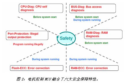 作為新能源汽車的核心部件。電機控制不僅關(guān)系著整車性能還與行車安全息息相關(guān)。在富士通的電機控制MCU設(shè)計中充分考慮了安全特性,通過6大安全機制來保證系統(tǒng)運行的安全可靠,包括:在系統(tǒng)啟動前進(jìn)行MCU的自我診斷、總線自診斷、RAM的自診斷;程序非法運行時非法輸出端口保護;系統(tǒng)運行期間進(jìn)行總線診斷、RAM錯誤糾正、閃存錯誤糾正。據(jù)透露,富士通在未來的產(chǎn)品計劃中,還將增加核心MCU的冗余設(shè)計(例如雙核或多核)以實現(xiàn)更強的系統(tǒng)保護。