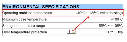 一般溫度操作可分成商規(guī)(0℃~+60℃)、工規(guī)(-25℃~+71℃)、軍規(guī)(-55℃~+85℃)等,在選擇DC/DC 電源模塊時(shí)需考慮實(shí)際系統(tǒng)操作溫度范圍,選用合適的溫度等級(jí)。