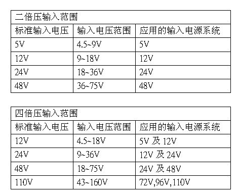 在選用電源模塊輸入電壓范圍時(shí),視輸入電壓變動(dòng)范圍,業(yè)界有二倍壓輸入及四倍壓輸入可選擇,電壓范圍如下: