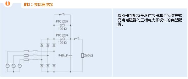 [page]上述電路采用三相橋式整流器,并將其接至相導(dǎo)線電壓為400 VRMS的電源中。其中平滑電容器的電容為940 μF。并聯(lián)電路含有兩個(gè)B59204J0130B010型充電電阻器,用于限定沖擊電流。亦稱為零電位電阻器,其額定電阻在25℃的環(huán)境溫度下為100 ?。在這種情況下,需要并聯(lián)兩元件:因?yàn)殡娔鼙仨氃诔潆娖陂g內(nèi)傳到電容器,這會(huì)使單個(gè)B59204J0130B010電阻器開(kāi)始發(fā)熱,直至溫度高出允許范圍,結(jié)果便導(dǎo)致電阻大大加強(qiáng)。這一情況應(yīng)當(dāng)避免,否則將無(wú)法對(duì)鏈路電容器進(jìn)行徹底充電。