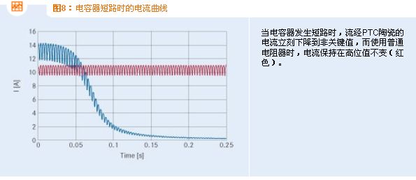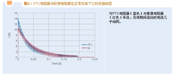 在這兩種情況下,充電電流的時(shí)間曲線幾乎相同。PTC陶瓷與固定電阻在電流特性方面的細(xì)微差別的產(chǎn)生原因是:
