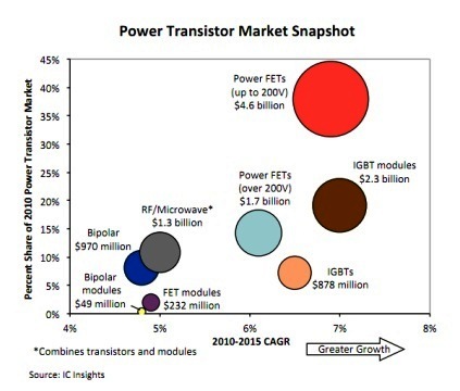 根據(jù)IC Insight的預(yù)測,整體功率電晶體市場營收將在2010至2015年間,取得6.4%的復(fù)合年平均成長率(CAGR),在2015年達到163億美元規(guī)模;同時期低電壓(200V以下)功率FET市場CAGR為6.7%,到2015年營收規(guī)??蛇_164億美元。