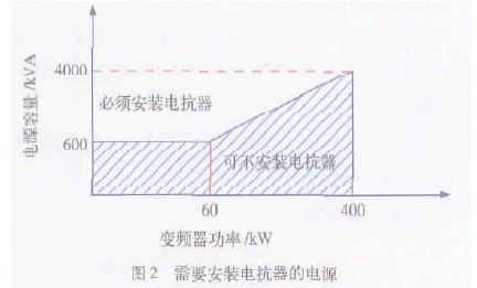 1 ) 變頻器所用之處的電源容量與變頻器容量之比為10∶1 以上;電源容量為600 kVA 及以上,且變頻器安裝位置離大容量電源在10 m 以內(nèi)。圖2 為需要安裝輸入電抗器的電源容量。