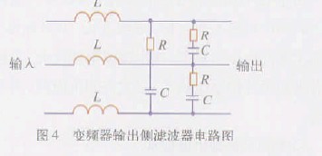 (2)變頻器輸出側(cè)濾波器參數(shù)圖4 為常用變頻器輸出側(cè)濾波器的電路圖。變頻器輸出側(cè)濾波器的輸入側(cè)接變頻器,輸出側(cè)接電動(dòng)機(jī)。