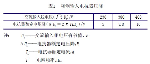 1)輸入電抗器壓降的選擇 輸入電抗器的容量一般按預(yù)期在電抗器每相繞組上的壓降來決定,而選擇壓降或用網(wǎng)側(cè)相電壓的2%~4%,或按表1 的數(shù)據(jù)選取。