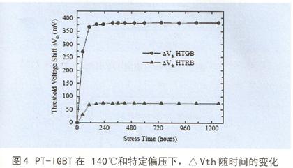 。圖4給出PT—IGBT(IRG4BC20F)在(1)柵已射極Gge=20V,Vce=OV(HTGB)和(2)Vge=0V,Vce=0.8V(HTRB)在140℃,經(jīng)過1200小時的應力試驗結(jié)果。由圖4中的HTGB曲線可見,柵偏置試驗開始后100小時內(nèi),