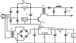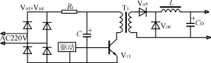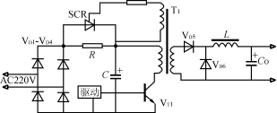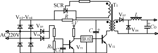 該電路如圖3所示。在電源瞬時接通時,輸入電壓經(jīng)整流橋VD1VD4和限流電阻R對電容器C充電。當電容器C充電到約80%的額定電壓時,逆變器正常工作,經(jīng)主變壓器輔助繞組產(chǎn)生晶閘管的觸發(fā)信號,使晶閘管導通并短路限流電阻R,開關電源處于正常運行狀態(tài)。