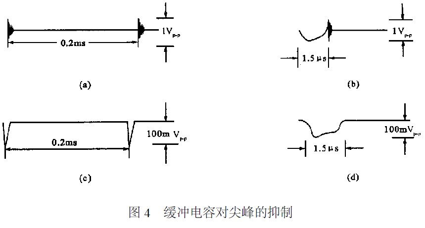 在開關(guān)三極管的CE之間,或者在續(xù)流二極管的兩端并聯(lián)RC緩沖電路可使尖峰干擾明顯減小。圖3中,三極管T關(guān)斷時(shí),集電極電壓上升,通過D和R1對C充電,使其上升速率變緩,選擇充電常數(shù)CR1的值可以控制上升速率。T導(dǎo)通時(shí),D截止,C對R1和R2放電,限制了導(dǎo)通瞬間的峰值電流。該緩沖電路改變了負(fù)載線的形狀,減少了開關(guān)三極管的損耗。在續(xù)流二極管兩端并上RC電路也同樣有效。圖3中,當(dāng)用3DD11和2CK120C時(shí),可并0.022LF左右的電容器(f=2kHz),該電容的容量有一最佳值,它的作用可以從圖4看出。圖4(a)是不加C的情況,將其在時(shí)間軸上放大后為圖4(b)。并上緩沖電容后分別見圖4(c)和(d)。
