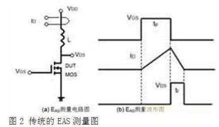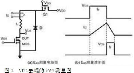 過去,傳統(tǒng)的測量EAS的電路圖和波形如圖2所示。注意到,VDS最后的電壓沒有降到0,而是VDD,也就是有部分的能量沒有轉(zhuǎn)換到雪崩能量中。