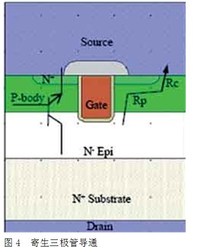 寄生三極管導通損壞:在MOSFET內(nèi)部,有一個寄生的三極管(見圖4),通常三級管的擊穿電壓通常低于MOSFET的電壓。當DS的反向電流開始流過P區(qū)后,Rp和Rc產(chǎn)生壓降,Rp和Rc的壓降等于三極管BJT的VBEon。由于局部單元的不一致,那些弱的單元,由于基級電流IB增加和三級管的放大作用促使局部的三極管BJT導通,從而導致失控發(fā)生。此時,柵極的電壓不再能夠關(guān)斷MOSFET。