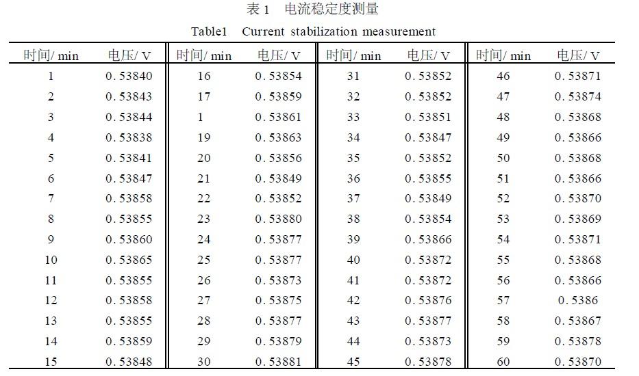 驅(qū)動電源一個重要技術(shù)參數(shù)為電流穩(wěn)定度。電流穩(wěn)定度是在一定時間內(nèi),多次測量通過負(fù)載的電流大小,然后通過數(shù)學(xué)計(jì)算得出輸出電流穩(wěn)定度大小。實(shí)驗(yàn)中每間隔一分鐘測量一次,測量時間持續(xù)一個小時。測量時,用1.2Ω50W電阻作為模擬負(fù)載,測量模擬負(fù)載的兩端電壓,用模擬負(fù)載兩端電壓穩(wěn)定性來標(biāo)定電流穩(wěn)定性。測量儀器為:電壓測量儀器:Agilent34401A61/2digitmultime2ter,其精度可以達(dá)到0.00001V;供電電源為Agi2lentE3631AtripleoutputDCpowersupply12V,1A。電流穩(wěn)定度實(shí)驗(yàn)數(shù)據(jù)如表1所示。