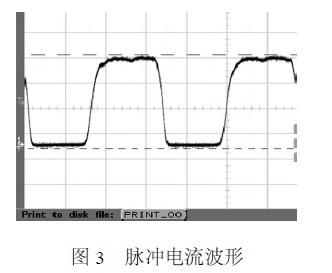 此保護(hù)電路已經(jīng)應(yīng)用于實(shí)踐,由于限流措施穩(wěn)定可靠,半導(dǎo)體激光器的使用壽命得到了保證。利用功率器件的開通與關(guān)斷強(qiáng)制吸收和隔離浪涌沖擊,使得在脈沖工作狀態(tài)下的浪涌沖擊也被很好地抑制,圖3是電源工作在脈沖狀態(tài)下,負(fù)載實(shí)際的電壓波形。