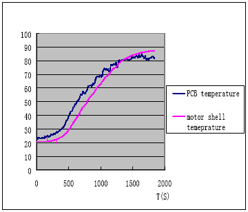 用上文所述的PPTC設(shè)計(jì)流程可以用在多功能豆?jié){機(jī)馬達(dá)防堵保護(hù)設(shè)計(jì)中,但這是往往會(huì)碰到選擇PPTC型號困難的問題,也就是說多功能豆?jié){機(jī)的馬達(dá)保護(hù)設(shè)計(jì)會(huì)較普通的小家電馬達(dá)保護(hù)復(fù)雜的多,圖4為磨制豆?jié){時(shí)PCB板周圍環(huán)境溫度和馬達(dá)外殼溫度的實(shí)測圖,可見控制電路PCB板PPTC周圍的環(huán)境溫度最高可以到達(dá)85C。由于豆?jié){機(jī)的PPTC最高環(huán)境溫度85度會(huì)比普通的小家電最高環(huán)境溫度要求高,這樣既要在85度的最大工作電流下能正常工作,還要保證在最低溫度0度的堵轉(zhuǎn)電流情況下能及時(shí)的保護(hù),相應(yīng)的就增大了設(shè)計(jì)難度。下面就具體的闡述此類多功能豆?jié){機(jī)馬達(dá)堵轉(zhuǎn)的保護(hù)設(shè)計(jì)方案?!?br />