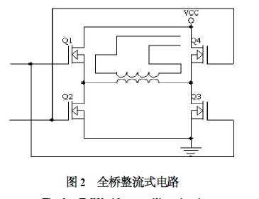 (2) 全橋整流式電路。圖2 所示為全橋整流式電路。該方案采用了4 個(gè)MOS 管,工作時(shí)對(duì)管同時(shí)導(dǎo)通,半周期內(nèi)Q1、Q3 導(dǎo)通,Q2、Q4 截止,然后Q2、Q4 導(dǎo)通,Q1、Q3 截止。這樣的工作方式使每半周期都有2 個(gè)MOS 管來分壓,對(duì)MOS管的耐壓要求就降低了,適用于高壓場(chǎng)合,但由于使用了4個(gè)MOS 管,使得損耗功率增加,開關(guān)損耗同時(shí)增加??紤]到農(nóng)業(yè)機(jī)械一般功率較大,采用該方案必然降低電能利用率,導(dǎo)致大量的能耗損失。