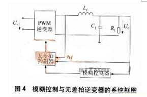 將輸出電壓和濾波電感電流反饋,即電壓誤差和電感電流作為輸入模糊變量,可以實(shí)現(xiàn)逆變器的模糊控制,整流性負(fù)載時(shí),其輸出電壓總諧波失真(total harmonic distortion,TH)小于5%,將模糊控制與無(wú)差拍控制相結(jié)合,可用來(lái)補(bǔ)償由于非線性負(fù)載導(dǎo)致的電壓降落,其系統(tǒng)如圖4所示。模糊控制從模仿人的思維外特性入手,模仿人的模糊信息處理能力。它對(duì)系統(tǒng)的控制是以人的經(jīng)驗(yàn)為依據(jù)的,而人的經(jīng)驗(yàn)正是反映人在思維過(guò)程中的判斷、推理、歸納。理論上已經(jīng)證明,模糊控制可以任意精度逼近任何線性函數(shù),但受到當(dāng)前技術(shù)水平的限制,模糊變量的分檔和模糊規(guī)則都受到一定的限制,隸屬函數(shù)的確定還沒(méi)有統(tǒng)一的理論指導(dǎo),帶有一定的人為因素,因此,模糊控制的精度有待于進(jìn)一步提高。