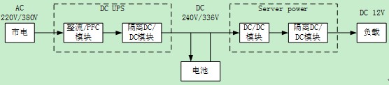 在UPS應(yīng)用的另外一個分支是目前正在興起的直流UPS系統(tǒng)。直流系統(tǒng)的思路是出于提高效率的目的,減少電源系統(tǒng)中間的轉(zhuǎn)換環(huán)節(jié),電力分配部分由原來的交流轉(zhuǎn)換成直流。一個理想的直流UPS系統(tǒng)服務(wù)器應(yīng)用從市電到12V終端的應(yīng)用結(jié)構(gòu)見下圖。