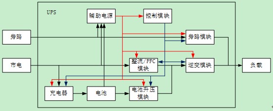對于負(fù)載端來說,能夠直接相連的只有旁路模塊與逆變模塊,而這兩個模塊是并聯(lián)的;