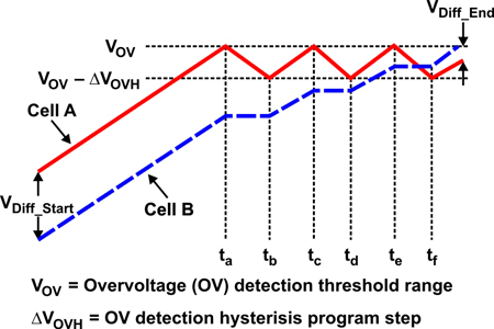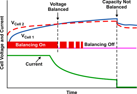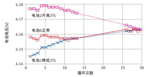 電池平衡算法只使用電壓發(fā)散作為平衡標(biāo)準(zhǔn),具有過平衡(或欠平衡)的缺點,這是由于存在阻抗失衡影響(請參見圖3和圖4)。問題是,電池阻抗還會在充電期間引起電壓差異(VDiff_Start和VDiff_End)。簡單的電壓電池平衡并未區(qū)分是電量失衡還是阻抗失衡。因此,這種平衡不能保證完全充電后所有電池均獲得100%的電量。