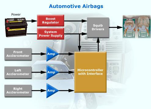 即使是小型的汽車目前都設(shè)有6個氣囊,而且所采用的安全標準要求極高。負責為氣囊充氣的是一款稱為爆管驅(qū)動器(squib driver)的特別芯片,該芯片必須能夠在撞車的緊急關(guān)頭立即啟動。按照圖1所示,氣囊系統(tǒng)由多個部分組成。