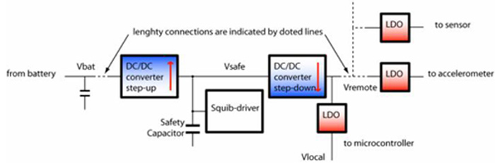 以下簡單介紹氣囊系統(tǒng)的充氣過程。氣囊系統(tǒng)設(shè)有升壓轉(zhuǎn)換器,一般來說,這些升壓轉(zhuǎn)換器都采用 sepic拓撲(sepic拓撲要求電路中采用兩個電感) 或回掃拓撲結(jié)構(gòu)(回掃拓撲中需要采用一個變壓器)。進行充氣之前,氣囊系統(tǒng)的升壓轉(zhuǎn)換器會先將電池電壓(Vbat)提高(這個電池電壓在負載突降時可高達 40伏),直至達到安全電壓(Vsafe)要求的電平,這樣可確保安全電容器儲存大量電能(見圖2)。之后才將這個較高的安全電壓調(diào)低至幾伏,這個較低的電壓稱為遠程電壓(Vremote)。必須嚴格按照這個充氣準備程序,以確保其后幾級的低壓降穩(wěn)壓器出現(xiàn)較少壓降。壓降越少,功耗也就越低,效率也就越高。