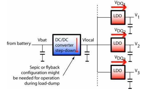 我們?nèi)舨捎瞄_關(guān)穩(wěn)壓器作為輸入級,再以多個低壓降穩(wěn)壓器提供輸出,便可降低電源系統(tǒng)的整體成本。高功率的電源系統(tǒng)甚至必須采用這樣的設(shè)計。圖4是其中一個示例。