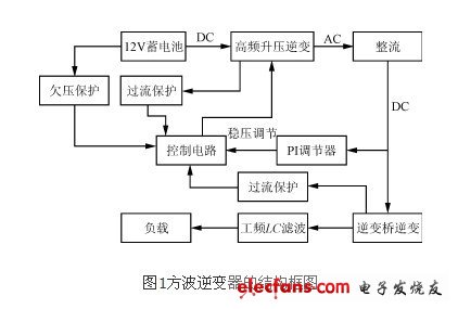 目前,構成DC/AC逆變的新技術很多,但是考慮到具體的使用條件和成本以及可靠性,本電源仍然采用典型的二級變換,即DC/DC變換和DC/AC逆變。首先由DC/DC變換將DC 12V電壓逆變?yōu)楦哳l方波,經高頻升壓變壓器升壓,再整流濾波得到一個穩(wěn)定的約320V直流電壓;然后再由DC/AC變換以方波逆變的方式,將穩(wěn)定的直流電壓逆變成有效值稍大于220V的方波電壓;再經LC工頻濾波得到有效值為220V的50Hz交流電壓,以驅動負載。
