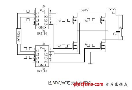 如圖3所示,DC/AC變換采用單相輸出,全橋逆變形式,為減小逆變電源的體積,降低成本,輸出使用工頻LC濾波。由4個IRF740構成橋式逆變電路,IRF740最高耐壓400V,電流10A,功耗125W,利用半橋驅動器IR2110提供驅動信號,其輸入波形由SG3524提供,同理可調節(jié)該 SG3524的輸出驅動波形的D<50%,保證逆變的驅動方波有共同的死區(qū)時間。