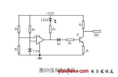 圖5中運算放大器的正向輸入端的電壓由R1和R3分壓得到,而反向輸入端的電壓由穩(wěn)壓管箝位在+7.5V,當蓄電池的電壓下降超過預定值后,運算放大器開始工作,輸出跳轉為負,LED燈亮,同時三級管V截止,向SG3524的SD端輸出高電平,封鎖IR2110的輸出驅動信號。