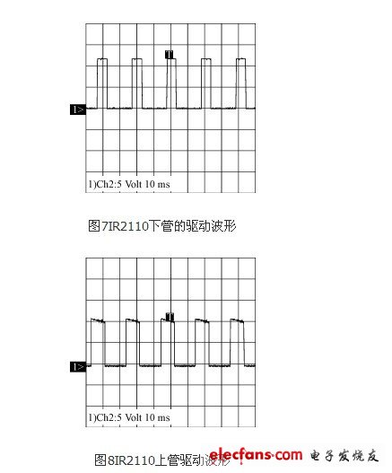 調試過程遇到的一個較為重要的問題是關于IR2110的自舉電容的選擇。IR2110的上管驅動是采用外部自舉電容上電,這就使得驅動電源的路數(shù)大大減少,但同時也對VB和VC之間的自舉電容的選擇也有一定的要求。經過試驗后,最終采用1μF的電解電容,可以有效地滿足自舉電壓的要求。