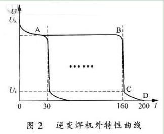 圖2所示即為高頻逆變焊機所普遍采用的一種行之有效的恒流帶外拖的外特性曲線。其中Uk為空載電壓,即焊機不工作時的輸出電壓。一個較高的空載電壓有助于起弧階段快速建立起穩(wěn)定的工作狀態(tài)。一般空載電壓為90V左右;AB段為起弧階段,即焊機建立工作狀態(tài)的過渡過程,近似于恒壓輸出。這個過程中變換器以最大脈寬輸出,以最快速度達(dá)到設(shè)定工作電流時該階段結(jié)束;BC段為穩(wěn)定工作階段,近似為恒流過程,使焊機具有一個平穩(wěn)、恒定的工作電流;CD段為外拖階段,由于焊機在頻繁的起弧和工作過程中焊槍很容易和工件短路粘連,造成焊接過程不順暢,如果此時系統(tǒng)檢測到一個較低的短路電壓后能夠相應(yīng)地增大輸出電流值,就可以將粘連部分熔斷,從而獲得一個連續(xù)、平穩(wěn)的焊接過程。
