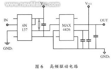 其中IN接自來于UC3879的輸出脈沖信號,CND1接控制電路地信號,GND2接被驅(qū)動MOS-FET的源極。6N137是一個高速光耦,傳輸延遲時間僅有40 ns。從控制電路來的信號經(jīng)過光耦隔離后送至驅(qū)動電路,使得控制電路和驅(qū)動電路有較好的電氣隔離,消除對控制電路的十?dāng)_。MAX4426是一個專門用于M0SFET的高頻驅(qū)動芯片,其內(nèi)部有兩個驅(qū)動電路,可以很容易地并聯(lián)以提供較大的輸出功率。典型上升、下降時間僅為20ns,延遲時間小大于40ns,可工作于1MHz,提供1.5A的峰值輸出電流。