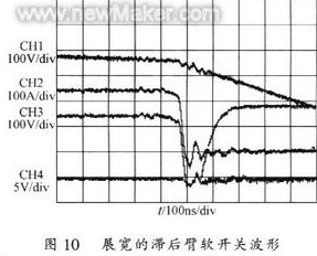 其中通道l和通道2分別為原邊電流、電壓波形;通道3為滯后臂管壓降,通道4為其驅(qū)動波形。圖10是圖9的局部展寬波形。從中可以明顯地看到當(dāng)滯后臂管壓降已經(jīng)諧振到零后,驅(qū)動脈沖才由低變到高,使其在零電壓下導(dǎo)通,實現(xiàn)軟開關(guān)。
