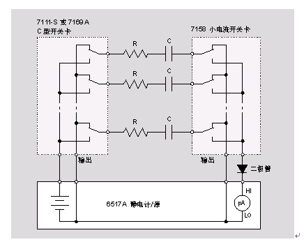 一個“同軸三柱-BNC”轉換器(7078-TRX-BNC型)被用于將6517A連接到7158型開關卡。電容器通過低噪聲同軸電纜連接到7158型開關卡??墒褂媒^緣線將7111-S開關卡連接到電容器。7169A型是通過接線頭連接器進行連接。