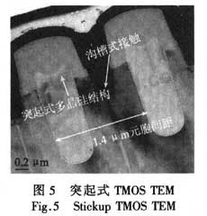 當(dāng)相鄰單位元胞尺寸不斷縮小后,尤其在設(shè)計柵極氧化膜較薄的器件時,在傳統(tǒng)的TMOS工藝中,源區(qū)注入會穿透柵極側(cè)壁影響器件性能。采用突起式結(jié)構(gòu)可以有效地避免刻蝕工藝及源區(qū)注入對較短溝道器件的間接影響,消除了器件穿通的風(fēng)險,保證了器件的穩(wěn)定性能和可重復(fù)性。