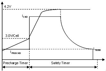 預(yù)充電安全定時器可避免長時間給電量耗盡的電池充電。一般說來,電池單元電壓達到 3.0 V,充電器就會進入 CC 階段??焖俪潆婋娏魍ǔO薅ㄔ?0.5 至 1C 之間,以避免過熱導(dǎo)致電池加速退化。應(yīng)選擇適當(dāng)?shù)乃俣龋_保電池溫度不超過 45oC,然后在快充速率下進行電池充電,直至電壓達到調(diào)節(jié)限度(對基于 LiCoO2 的陰極而言通常是每單元 4.2 V)。充電器開始調(diào)節(jié)電池電壓并進入 CV 階段,這時充電電流會呈指數(shù)地下降至預(yù)定終止水平,結(jié)束電池充電。