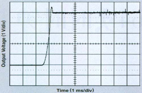在一些典型的啟動應(yīng)用中,TPS64203限流值慢慢上升,以提供限流的受控軟啟動。在這種應(yīng)用中,限流電路和軟啟動均無效;因此,啟動浪涌電流會很大,而輸出電壓會稍稍過沖,如圖 4 所示。