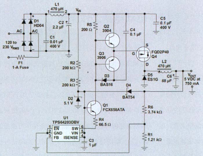 圖 1 顯示了完整的轉(zhuǎn)換器。整流器電路使用一個標準、快速開關(guān)整流器二極管橋接 (D1) 和一個LC濾波器(L1和C2),我們將對其余組件進行更加詳細的介紹。