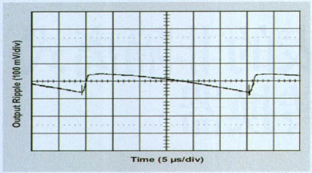 相對較高的K值最小化了電感值,并且經(jīng)證明是可以接受的,因為這種特殊應(yīng)用的穩(wěn)態(tài)輸出紋波要求小于0.02 × VOUT,即高負載時的100mVPP。磁滯后,TPS6420x控制器一般在輸出電壓有一些紋波時工作效果最佳,建議使用至少 50mΩ ESR的輸出電容可產(chǎn)生ΔVPP(ESR) = ΔIL × RESR的紋波電壓,其一般遠超出電壓紋波的電容分量。圖2顯示了該應(yīng)用測得紋波。