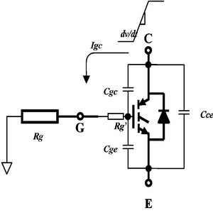 為了理解dV/dt感生開通現(xiàn)象,我們必須考慮跟IGBT結(jié)構(gòu)有關(guān)的電容。圖1顯示了三個主要的IGBT寄生電容。集電極到發(fā)射極電容C,集電極到柵極電容C和柵極到發(fā)射極電容CGE。