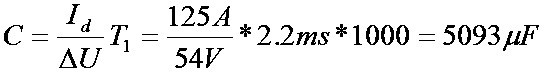 式中,Id為輸入電流125A;△U為電壓變化量(△U =Ud0×10%=54V);T1為電容放電時(shí)間; Ud0為空載直流電壓540V;T為工頻交流電周期20ms;為工頻交流電角頻率),可得: