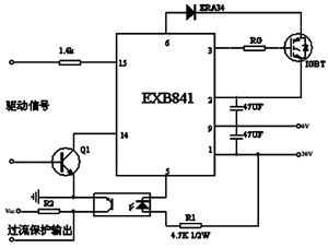 隨著IGBT在各類(lèi)變流裝置中的廣泛應(yīng)用,IGBT驅(qū)動(dòng)模塊的選擇及其性能越來(lái)越引起使用者的重視。理想的驅(qū)動(dòng)模塊除了應(yīng)為IGBT提供足夠的開(kāi)通和關(guān)斷柵壓外,還應(yīng)具備迅速、可靠的保護(hù)功能,同時(shí)力求電路簡(jiǎn)單、穩(wěn)定。IGBT的常用驅(qū)動(dòng)模塊有許多種,其中EXB系列應(yīng)用最廣。EXB841驅(qū)動(dòng)模塊廣泛應(yīng)用于開(kāi)關(guān)電源、UPS、電力傳動(dòng)及電力補(bǔ)償?shù)阮I(lǐng)域。圖4所示是本設(shè)的IGBT的驅(qū)動(dòng)電路圖。
