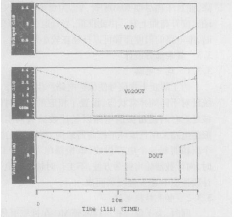 本芯片采用0.6μm的標準CMOS工藝。使用49級HSPICE模型進行仿真。圖4為過充電保護及復(fù)原波形圖,圖5為過放電保護及復(fù)原波形圖。