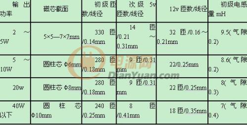 制作RCC型電源關(guān)鍵是脈沖變壓器T的繞制。無論何種開關(guān)電源脈沖變壓器的計(jì)算是極繁瑣又極不準(zhǔn)確的,對(duì)業(yè)余制作者來說通過估算,實(shí)驗(yàn)調(diào)整來確定比較實(shí)際。即使是估算也涉及磁芯材料,結(jié)構(gòu)的影響,限于目前市場(chǎng)產(chǎn)品參數(shù)的離散性,業(yè)余者也難以確定,此處只列出部分計(jì)算結(jié)果供參考。小功率開關(guān)電源脈沖變壓器制作參數(shù)(繞組功能參考附圖)如附表所示。