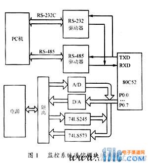 為了組建開關(guān)電源監(jiān)控系統(tǒng),系統(tǒng)中的每臺電源配置了一個獨(dú)立的監(jiān)控系統(tǒng)通信模塊。監(jiān)控系統(tǒng)通信模塊采用的控制芯片是MCS51系列單片機(jī)80C52。80C52具有8k的內(nèi)部ROM和256字節(jié)的內(nèi)部RAM。監(jiān)控系統(tǒng)通信模塊電路結(jié)構(gòu)圖如圖1所示。計算機(jī)通過該通信模塊可以實時讀取電源的輸出電壓、輸出電流值以及輸出過壓、輸入過壓、輸入欠壓、過流、過熱、運(yùn)行/停止等8路開關(guān)量的狀態(tài)值,并可以在輸出值允許的范圍內(nèi)任意設(shè)置電源的輸出電壓、輸出電流值和復(fù)位、合閘、分閘、機(jī)控/本控4路開關(guān)量的狀態(tài)值。從監(jiān)控系統(tǒng)通信模塊電路結(jié)構(gòu)示意圖可以看出,如果計算機(jī)需要讀取電源模塊的輸出電壓、輸出電流值和開關(guān)量的狀態(tài)時,單片機(jī)收到請求命令后啟動A/D轉(zhuǎn)換芯片MAX182對電源的輸出電壓、輸出電流兩路模擬量進(jìn)行轉(zhuǎn)換,轉(zhuǎn)換后的數(shù)據(jù)送入單片機(jī)進(jìn)行數(shù)據(jù)處理。同時表征電源運(yùn)行狀態(tài)的8路開關(guān)量從雙總線收發(fā)器74LS245讀入送至單片機(jī)寄存器存貯。單片機(jī)將所有處理后的數(shù)據(jù)按預(yù)定數(shù)據(jù)傳送格式發(fā)送給計算機(jī)輸出顯示。計算機(jī)需要設(shè)置電源的輸出電壓、輸出電流值和4路開關(guān)量的狀態(tài)時,計算機(jī)將設(shè)置好的數(shù)據(jù)按預(yù)定格式發(fā)送給單片機(jī)。單片機(jī)接收處理后啟動D/A轉(zhuǎn)換芯片MAX532和輸出鎖存器74LS573將處理后的輸出電壓、輸出電流值和開關(guān)量狀態(tài)值輸出給電源。監(jiān)控系統(tǒng)通信模塊從而實現(xiàn)了計算機(jī)對電源的實時監(jiān)控。為了保證設(shè)計人員的安全和防止通信模塊受電源影響而損壞,電源與通信模塊之間的信號傳遞均通過光耦隔離。